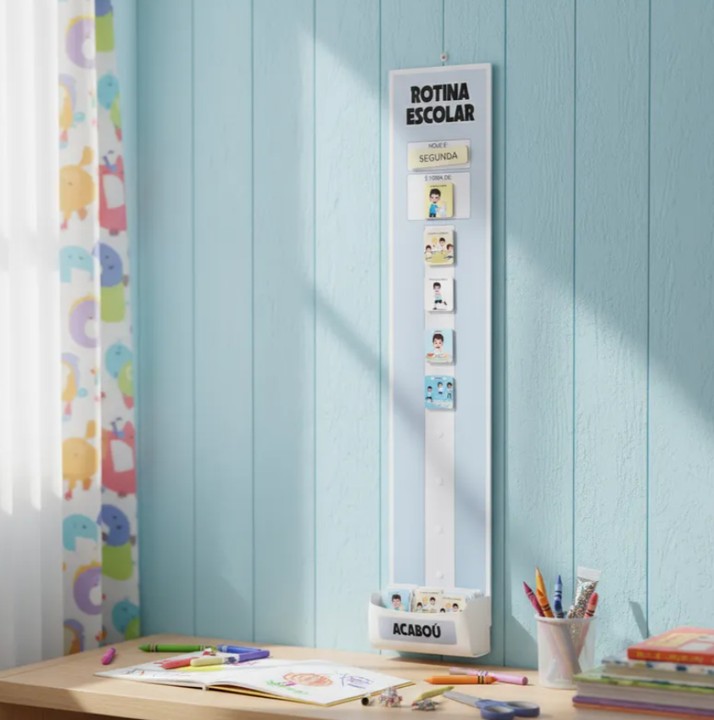 Quadro rotina escolar com porta peças, confeccionado em PVC de alta qualidade.