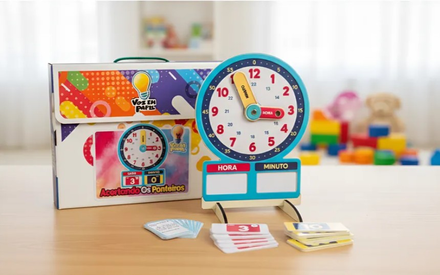 O produto indicado para ensinar horas e minutos, tanto na forma convencional (1 a 12) quanto na forma de 13ª a 24ª hora, é um relógio com ponteiros móveis, acompanhado de plaquinhas com números e cartas de perguntas.