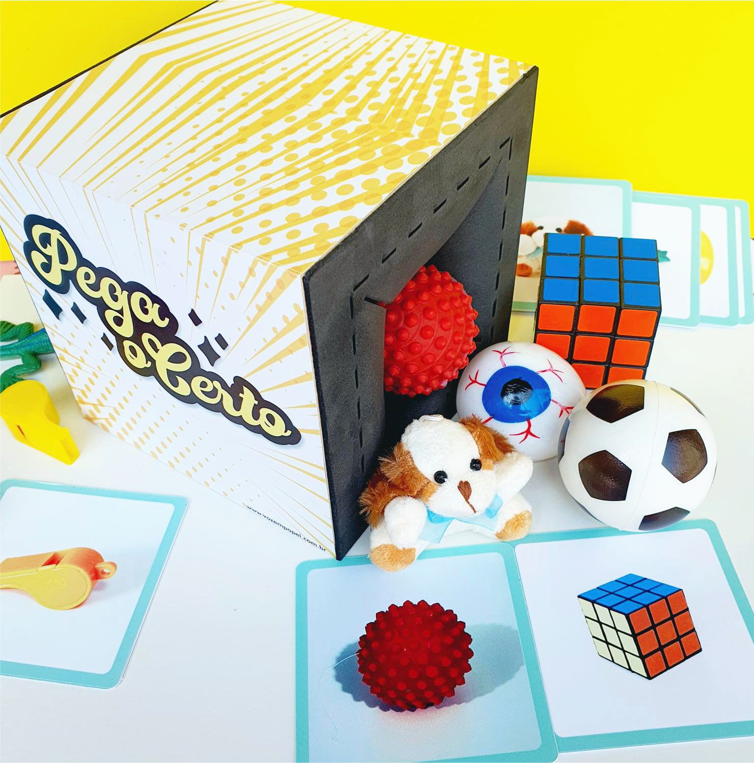 O objetivo do material é trabalhar de forma lúdica usando a mão dentro da caixa para reconhecer os objetos.